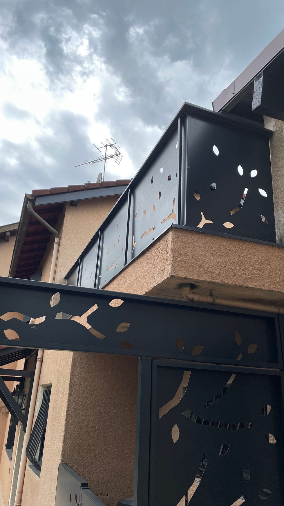 Ce projet 100% aluminium est né d'une esquisse client. Un premier grand brise-vue permet de délimiter l'espace. Un second équipé d'un portillon dissimule le local poubelle, enfin, la rambarde existante a été habillée par une tôle décorative pour l'embellir harmonieusement afin de gagner une parfaite intimité.